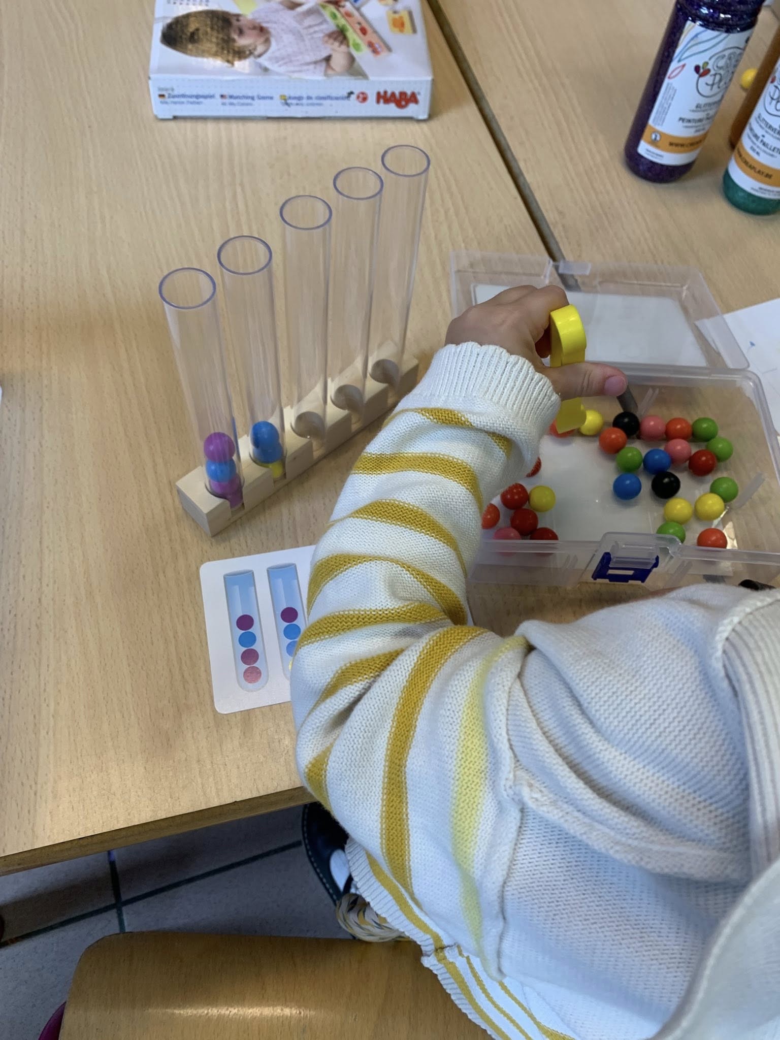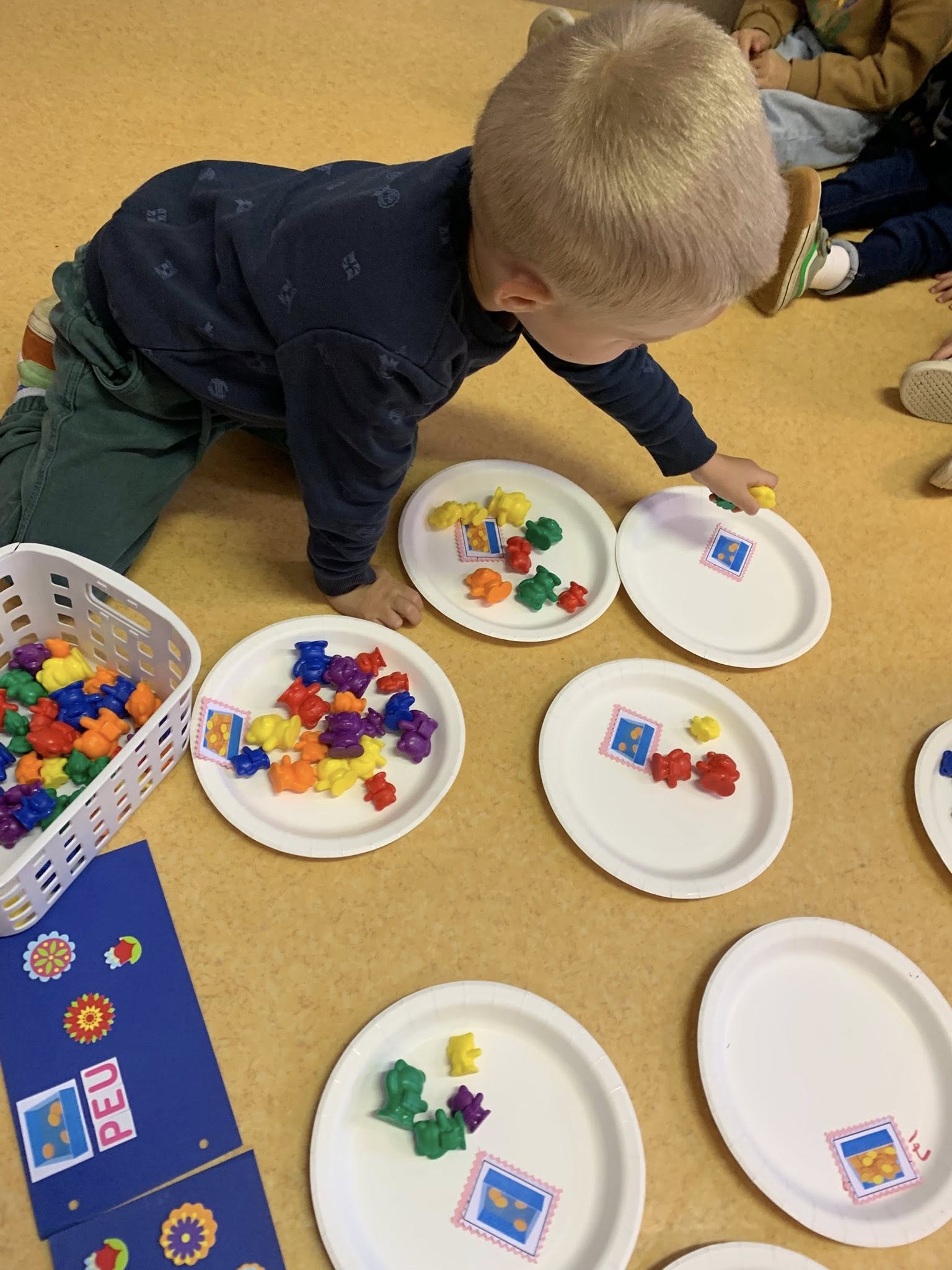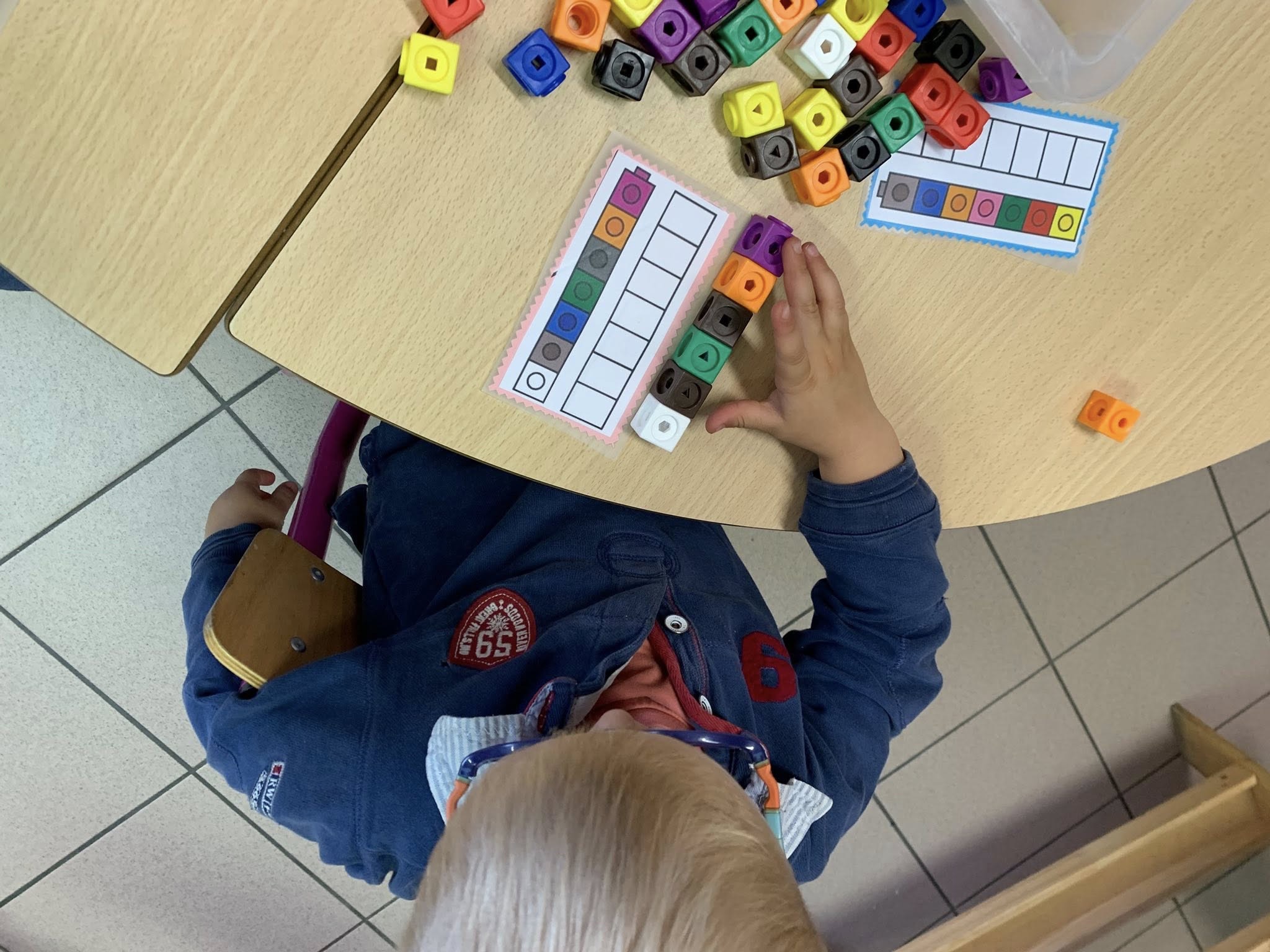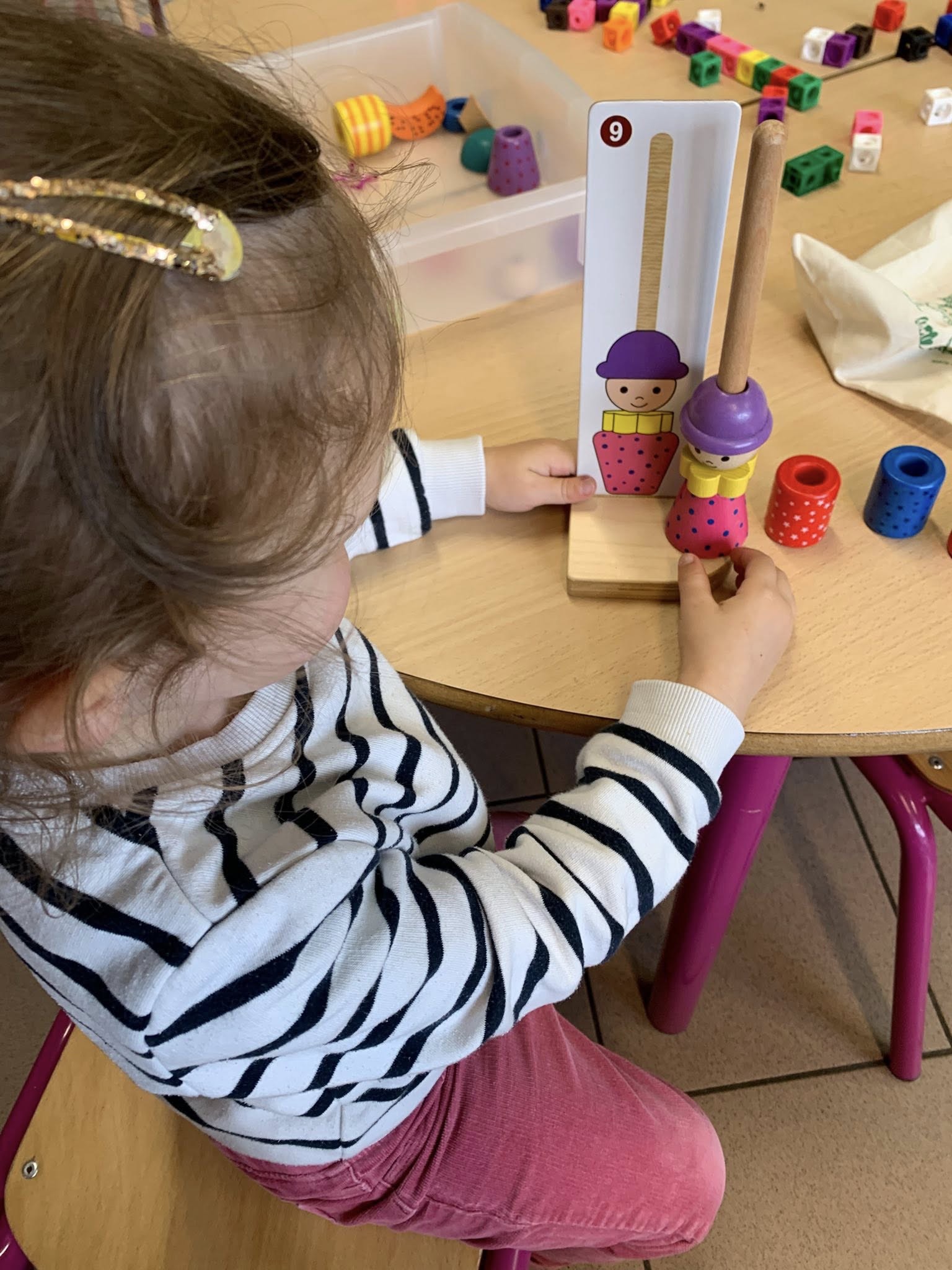 Grâce aux comptines et petits jeux mathématiques, les enfants commencent aussi à compter et à découvrir les premiers nombres, jusque 3 ou 4, en jouant.